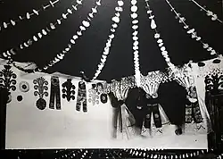 Wnętrza izb zdobione były kwiatami z bibułki[64] i kompozycjami z suszonych i nierzadko farbowanych zbóż, ziół i kwiatów. Dekorowano nimi głównie tzw. święty kąt, ustawiano je przy figurach świętych i obrazach. Kwiatki z cienkiej bibuły mocowano na drucie[65]. Wykonywano również konstrukcje z bibułkowych kwiatów i słomy, które miały zasłonić zniszczone ramy obrazów[66].