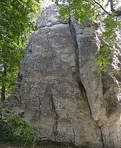 Zbudowana z wapienia skała ma wysokość 15 m, miejscami połogie, miejscami pionowe lub przewieszone ściany z filarem i kominem[3].