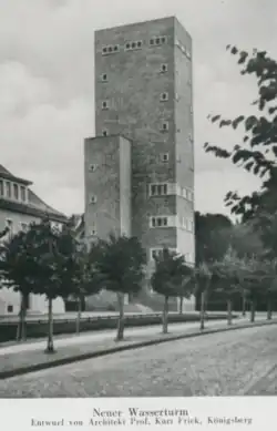 - 30-metrowa prostopadłościenna wieża ciśnień ze schroniskiem młodzieżowym na dwóch poziomach w Braniewie, 1931[4][5]