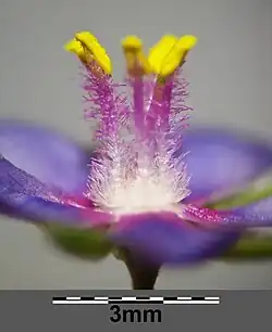 - Pięciopłatkowe, o średnicy 5 mm. Płatki korony drobno ząbkowane, niebieskie, u nasady czerwono nabiegłe. Osadzone pojedynczo w kątach liści.