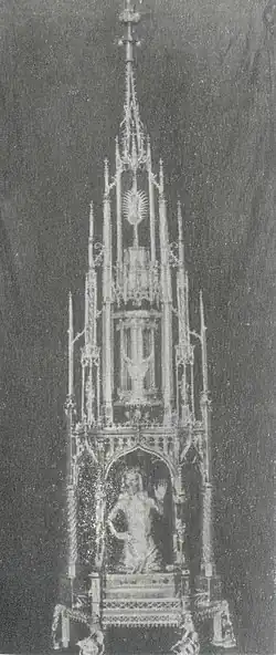 Zabytek (wysokość 127 cm, szerokość 36,5 cm) był wykonany ze złoconego srebra, niektóre elementy były odlewane. Miał postać sześciobocznej, trójkondygnacyjnej wieży wspartej na nóżkach z figurami lwów. W dolnej części znajdowała się figurka Chrystusa jako Męża Boleści, a ponad nią melchizedek. W górnej części była przedstawiona Matka Boża na półksiężycu trzymająca w ręce kielich. Program ideowy kustodii był antyhusycki. Figurka Męża Boleści podkreślała rzeczywistą obecność Chrystusa w Najświętszym Sakramencie.