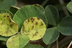 Początkowo na liściach, najpierw na górnej, a następnie również i na dolnej stronie, pojawiają się okrągłe drobne plamy wielkości 1–3 mm z wyraźnie zarysowanymi brzegami. Plamy te są najczęściej brunatne, ale ich kolor może być różny np. żółty, ciemnoczerwony, czarny i szarobrunatny. Następnie plamy mogą się przenieść na ogonki liściowe, łodygi, a nawet strąki. Liście gęsto pokryte plamami opadają, co powoduje obniżenie jakości i ilości plonu: zmniejszenie ilości zielonki, siana, pogorszenie wartości paszowej i obniżenie plonu nasion[3].