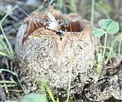 Typu apotecjum, na trzonie o długości do 5 cm, zwykle całkowicie zagłębionym w podłożu[3]. Młode owocniki są zwykle całkowicie zakopane w piasku, widoczne są tylko nieco ich brzegi, często w kształcie gwiazdy. Powierzchnia dolna i górna o barwie od blado do ciemnobrązowego. Miąższ kruchy[4].