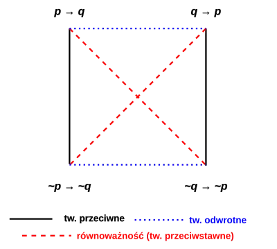 Również implikacja odwrotna i przeciwna są połączone przerywaną czerwoną linią. Poprzez zamianę zmiennych (podstawienie za i odwrotnie) z powyższej tautologii otrzymujemy bezpośrednio zdanie:
