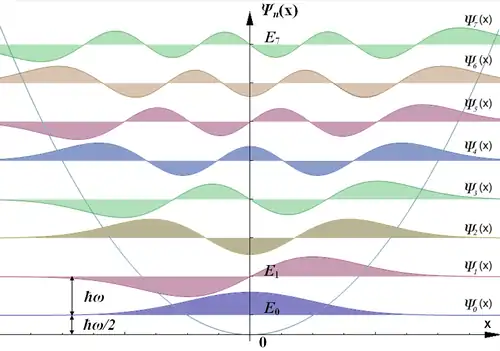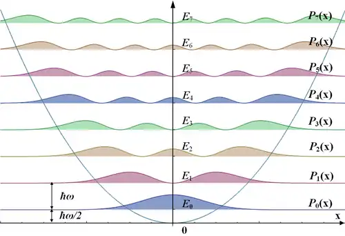 Energia potencjalna oscylatora (niebieska parabola) i kilka pierwszych stanów własnych w zależności od wychylenia Wykresy umieszczono na wysokościach odpowiadających energiom tych stanów. Zaznaczono skok wartości energii Energia stanu podstawowego jest większa od zera. Widać też, że amplituda ruchu wzrasta z energią.Gęstości prawdopodobieństwa odpowiadające funkcjom falowym Z wykresów widać, że szansa znalezienia oscylatora w pobliżu maksymalnego wychylenia od położenia równowagi jest największa. Odpowiada to sytuacji oscylatora klasycznego, który w punktach amplitudy przebywa najdłużej. U dołu – gęstość prawdopodobieństwa dla stanu podstawowego: widać, że w tym stanie oscylator najczęściej znajduje się w położeniu równowagi. Zaznaczono wartości energii odpowiadające rozkładom