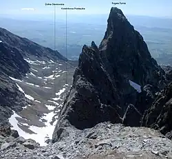 ![]() Kwietnikowa Przełączka widoczna pomiędzy Staroleśnym Szczytem a Rogatą Turnią (widok znad Granackiego Stawu) | |