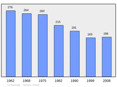 Według danych na rok 1990 gminę zamieszkiwało 191 osób, a gęstość zaludnienia wynosiła 19 osób/km² (wśród 747 gmin Limousin La Bazeuge plasuje się na 440. miejscu pod względem liczby ludności, natomiast pod względem powierzchni na miejscu 556.).