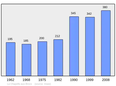 Według danych na rok 1990 gminę zamieszkiwało 345 osób, a gęstość zaludnienia wynosiła 69 osób/km² (wśród 747 gmin Limousin La Chapelle-aux-Brocs plasuje się na 328. miejscu pod względem liczby ludności, natomiast pod względem powierzchni na miejscu 645.).
