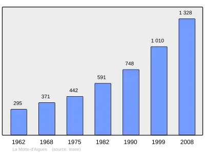 Według danych na rok 2008 gminę zamieszkiwało 1328 osób, a gęstość zaludnienia wynosiła 90 osób/km² (wśród 963 gmin regionu Prowansja-Alpy-W. Lazurowe La Motte-d’Aigues plasuje się na 425. miejscu pod względem liczby ludności, natomiast pod względem powierzchni na miejscu 603.).