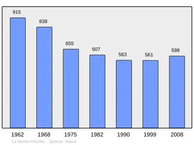 Według danych na rok 1990 gminę zamieszkiwały 563 osoby, a gęstość zaludnienia wynosiła 15 osób/km² (wśród 747 gmin Limousin La Roche-l’Abeille plasuje się na 230. miejscu pod względem liczby ludności, natomiast pod względem powierzchni na miejscu 98.).