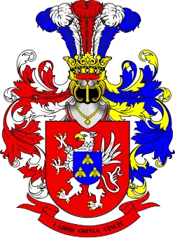 W polu czerwonym, na srebrnym gryfie - tarcza błękitna, na której są trzy złote pszczoły. Klejnot: pięć piór strusich, skrajne błękitne, następne srebrne i środkowe czerwone. Dewiza na czerwonej wstędze: "Labor omnia vincit" -(czyli: Praca wszystko zwycięża). Labry z prawej strony czerwono-srebrne, z lewej błękitno-złote.