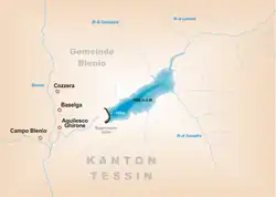 Znajduje się w grupie górskiej Adula, stanowiącej część Alp Lepontyńskich, po południowej stronie głównego grzbietu Alp, będącego tu zarazem fragmentem Wielkiego Europejskiego działu Wodnego. Powstał na terenie dawnej wioski Ghirone (obecnie w granicach gminy Blenio, ok. 40 km na północ od Bellinzony. Od strony północnej nad zbiornikiem wznosi się masyw Pizzo Pianca (2377 m n.p.m.), od wchodu Torno (2556 m n.p.m.), a od południa Torre di Nav (2832 m n.p.m.)[1].