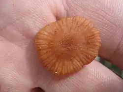 Średnica 3–30 mm, za młodu wypukły, później płaskowypukły, w końcu nieco lejkowaty. Brzeg silnie prążkowany do połowy promienia kapelusza. Powierzchnia gładka lub drobno łuskowata, pomarańczowobrązowa[4].