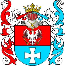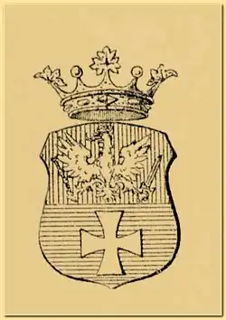 Na tarczy dzielonej w pas, w polu górnym, czerwonym, orzeł srebrny w koronie trzymający berło i miecz; w polu dolnym, błękitnym, krzyż jerozolimski.