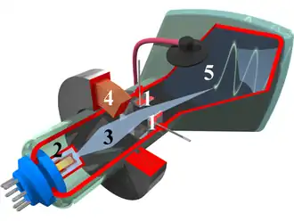 Lampa oscyloskopowa (z łac. oscillare kiwać się i gr. skopein, patrzeć) to lampa obrazowa charakteryzująca się elektrostatycznym odchylaniem wiązki elektronów. Elektrony emitowane przez katodę formowane są w wąską wiązkę w dziale elektronowym (katoda też jest częścią działa elektronowego). Wiązka elektronów wytworzona przez podgrzany drucik – katodę – wysłana zostaje w kierunku ekranu, ilość elektronów – jasność plamki – reguluje potencjał cylindra Wehnelta, natomiast ostrość – potencjały anod przyspieszających, zwiększających jednocześnie prędkość elektronów. Nieodchylona wiązka trafia dokładnie w środek ekranu i rysuje tam świecący punkt. Do odchylenia wiązki tak, aby mogła trafić w każdy punkt ekranu, służą dwie pary płytek odchylających – jedna dla kierunku pionowego, druga dla poziomego.