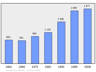 Według danych na rok 1990 gminę zamieszkiwało 1508 osób, a gęstość zaludnienia wynosiła 74 osoby/km² (wśród 1545 gmin Langwedocji-Roussillon Laroque-des-Albères plasuje się na 249. miejscu pod względem liczby ludności, natomiast pod względem powierzchni na miejscu 371.).