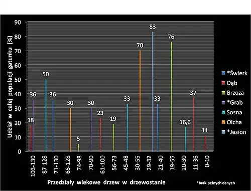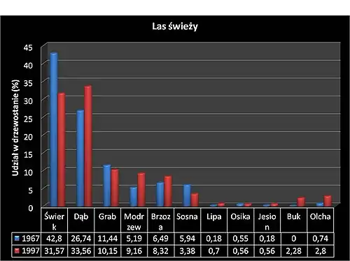 Las mieszany wilgotny – udział gatunków drzew w drzewostanie