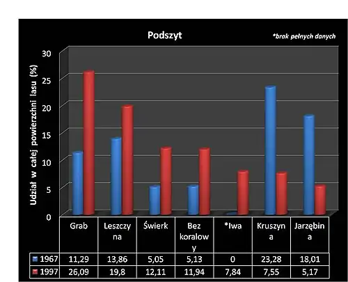 Domieszki w typach siedliskowych lasu (dane z roku 1967)
