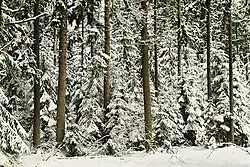 Siedliska, w których drzewostan jest zdominowany przez świerk w 50% i więcej, w wieku przekraczającym 73 lata (dane z 1997) są bardzo liczne. Zajmują one 50,09 ha Lasu Miejskiego. Siedliska gdzie świerk miał udział w drzewostanie poniżej 50%, a wiek powyżej 98 lat (dane z 1997) zajmowały 46,85 ha. Z najciekawszych miejsc należy wymienić duży obszar na północnym wschodzie lasu o powierzchni 7,74 ha. Świerk ma tutaj 70% udział w drzewostanie a jego wiek na rok 1997 to 93 lata. Bardzo podobnie rysuje się charakterystyka innego płatu leżącego przy wschodniej ścianie lasu. Świerk ma tu również 70% udział, a jego wiek w 1997 sięgał 98 lat. Obszar ten ma powierzchnię 5,84 ha. Należy również wspomnieć o jednym z najbardziej okazałych drzewostanów świerkowych w Lesie Miejskim. We wschodniej części lasu, obszar o powierzchni 10,68 ha cechował się obecnością tego drzewa w wieku 88 lat (dane z 1997) i udziale 60%. Są również miejsca, gdzie świerk miał (w 1997) wiek dochodzący do 128 lat. Jednak najczęściej jego udział w drzewostanie nie przekracza 20%. Takie miejsca to niektóre obszary na zachodzie lasu. Mają one największe powierzchnie dochodzące do 4,71 i 7,07 ha. Jednak te najokazalsze leżą na południu. Cała południowa ściana Lasu Miejskiego o powierzchni 19,28 ha to drzewostan, w którym świerk z udziałem 20% miał (dane z 1997) wiek 128 lat.