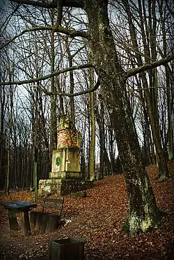 Wieża widokowa została wysadzona w powietrze przez wojska niemieckie jeszcze w początkach pierwszej wojny światowej (1914), aby zlikwidować dogodny dla Rosjan punkt obserwacyjny. Po I wojnie światowej postawiono natomiast naprzeciw strzelnicy, po drugiej stronie największego stawu karpiowego pomnik poświęcony poległym żołnierzom niemieckim z 82 Królewskiego Pułku Artylerii Polowej. Pomnik przedstawiał na wysokim prostopadłościennym cokole dwóch przykucniętych artylerzystów. Autorem jego był artysta z Pieniężna – Georg Fugh.
