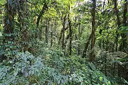 - lasy górskie mgliste w niższych położeniach (lower montane cloud forest – LMCF) – z drzewami jeszcze stosunkowo wysokimi,
