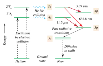 Proces wzbudzania lasera HeNe zaczyna się od zderzenia elektronów z wyładowania elektrycznego z atomami helu. Wzbudzany atom helu przechodzi ze stanu podstawowego do stanu 23S1 lub 21S0, przejście promieniste z tych stanów do poziomu podstawowego jest zabronione, przez co są to stany metastabilne, stany takie pozostają długo wzbudzone. Zderzenie wzbudzonego atomu helu z atomem neonu w stanie podstawowym wywołuje transfer energii z atomu helu do atomu neonu. Atom helu powraca do stanu podstawowego, a atom neonu wzbudzany jest odpowiednio do stanu z poziomu 5s (3s) lub 4s (2s)[a]. Przejście do tego stanu jest spowodowane niewielką różnicą energii wzbudzonych atomów helu i neonu (ΔE)[2].
