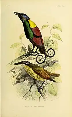 - 1 2 Systematyka i nazewnictwo polskie za: P. Mielczarek & M. Kuziemko: Rodzina: Paradisaeidae Vigors, 1825 – cudowronki – Birds of Paradise (wersja: 2022-09-03). [w:] Kompletna lista ptaków świata [on-line]. Instytut Nauk o Środowisku Uniwersytetu Jagiellońskiego. [dostęp 2023-05-21].