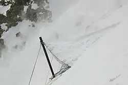 - utrzymywanie czapy śniegowej w miejscu jej pierwotnego zalegania, poprzez instalację barier śnieżnych. Tego typu lekkie (fizycznie i wizualnie) instalacje nie dopuszczają do spełzywania się czapy śniegowej (o miąższości do ok. 4,5 m), a tym samym wygaszają lawiny śnieżne u źródła. Tego typu instalacje są powszechnie stosowane na świecie, ale w Polsce nie są spotykane. Na okres letni mogą być szybko demontowane w celu dodatkowego zmniejszenia oddziaływania estetycznego na otoczenie. Ideę funkcjonowania takiej bariery przedstawiono na zdjęciu obok;
