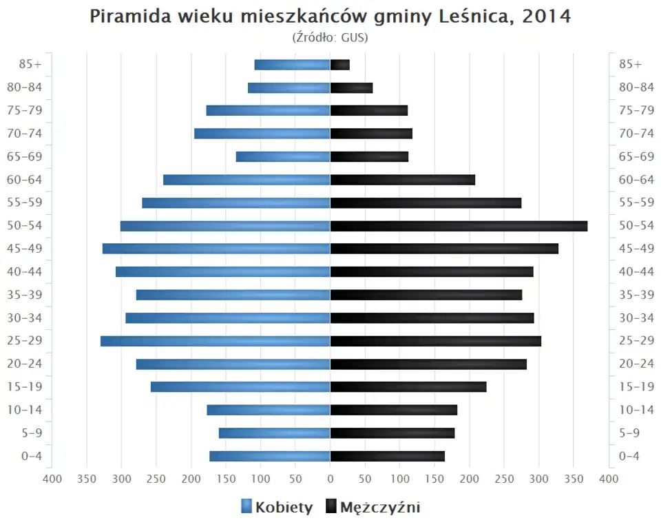 - Piramida wieku mieszkańców gminy Leśnica w 2014 roku[1].