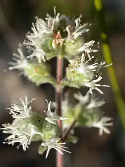 Krzewinka o wysokości 35–60 cm. Łodyga czworoboczna, owłosiona, wzniesiona, zazwyczaj nierozgałęziona. Liście pojedyncze, niewielkie (do 2,5 cm długości), obficie owłosione i szarozielone. Kwiaty grzbieciste, niewielkie, obupłciowe, białe lub kremowe. Wsparte są szarozielonymi przysadkami i zebrane są w gęste niby-kłosy[5][7]. Rośliny kwitną od kwietnia do września[5].
