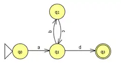 Przykład automatu akceptującego język spełniający lemat o pompowaniu – a(bc)*d