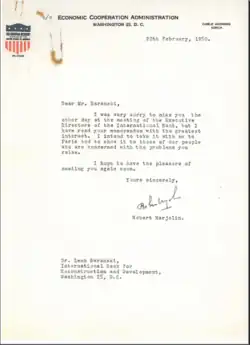 W początkach roku 1950 Leon Barański, być może inspirowany przez Józefa Retingera[13], opracował obszerne, blisko 30-stronicowe memorandum O Ekonomicznej Integracji Zachodniej Europy[9, 14]. Podkreślał korzyści płynące z utworzenia wspólnego rynku i akcentował potrzebę wskazania źródeł finansowania niezbędnych dla modernizacji gospodarki. Analizował cechy powstających wspólnot ekonomicznych na przykładach USA, Niemiec po 1871 r. oraz Polski, po pierwszej wojnie światowej. Memorandum przekazane, między innymi, Robertowi Marjolin, francuskiemu ekonomiście uznawanemu za jednego z architektów powojennej Europy, spotkało się z niemal entuzjastyczną jego oceną (fot. 3)