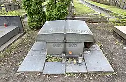 Jego nagrobek został zaprojektowany przez Mariana Wnuka[13]. Przedstawia trzy leżące jedna na drugiej księgi, z których dwie są zamknięte, a trzecia, górna – otwarta[13].
