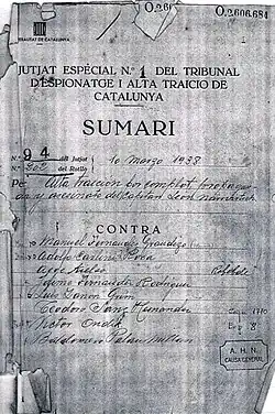 - ↑ Przechowywanych w zespole Jutjat Especiál No 1. del Tribunal D’Espionatge i Alta Traició de Catalunya.