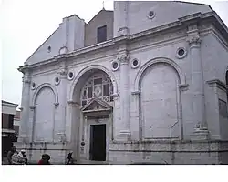 Jego pierwsze dzieło, Tempio Malatestiano, powstało dopiero w 42 roku życia Albertiego. Sigismondo Pandolfo Malatesta, książę Rimini, zlecił Albertiemu przebudowę kościoła franciszkanów na świątynię grobową dla niego samego i jego żony. Budowa nie została ukończona z powodu kłopotów finansowych księcia i jego śmierci. Zachowana dziś nawa stanowi tylko część planowanego budynku. Elewacja obecnej świątyni składa się z dwóch nierównej wysokości kondygnacji. Dolna podzielona jest na trzy pola przy pomocy półkolumn korynckich, między którymi znajdują się arkady. W środkowej najszerszej znajduje się portal zwieńczony ciężkim trójkątnym przyczółkiem. Ta cześć fasady miała nawiązywać do łuków triumfalnych, np. łuku Augusta w Rimini. W górnej nie ukończonej kondygnacji miała znajdować się nisza – o wymiarach tej poniżej, natomiast po bokach miały ją ujmować połówki segmentowego łuku.