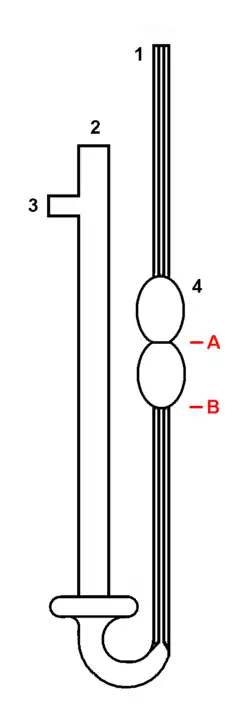Lepkościomierz jest zbudowany z dwóch rurek, połączonych ze sobą. Lewa, szeroka rurka (2) jest poszerzona w dolnej części, a w górnej ma dodatkową rurkę boczną (3). Prawa rurka (1) składa się z dwóch połączonych zbiorniczków (4) osadzonych w środkowej części kapilary.