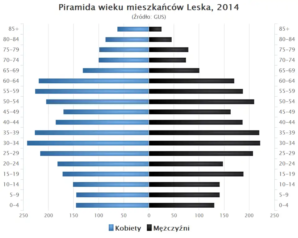 - Piramida wieku mieszkańców Leska w 2014 roku[22], na podstawie danych GUS: