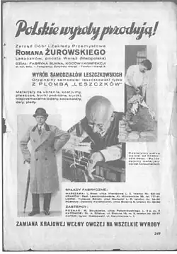 - ↑ 30/10 1946 r. została wypisana z Rej. Handlowego w Zamościu Zakłady Przemysłowe Romana Żurowskiego „Leszczków” Sp. z o.o. (RHB 93) wobec przeniesienia siedziby firmy do Bielska – Monitor Polski Nr. 32, s. 5, 27/3 1948 r.; 7 maja 1948 r. Sąd Okręgowy w Cieszynie wpisał (III R.H.B./VI-149 wymienioną spółkę z siedzibą w Bielsku – Monitor Polski nr 56 s. 10, 20/6 1948 r.