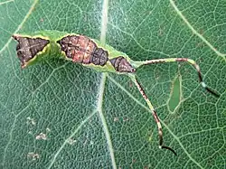 Gąsienica ostatniego stadium ma ubarwienie zielone z brunatnym znakiem za głową, brunatnym siodłem oraz brunatnozielonymi widełkami na wierzchołku odwłoka. Barwa jej ciała ciemnieje do brudnobrązowej przed przepoczwarczeniem[1].