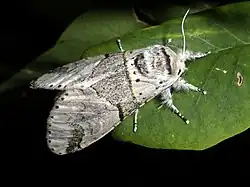 Motyl o krępym ciele[8] i rozpiętości skrzydeł sięgającej od 38 do 43 mm[3]. Głowa jest zaopatrzona w słabo owłosione oczy złożone, bardzo krótkie głaszczki, natomiast pozbawiona jest przyoczek i ssawki. Czułki nie osiągają połowy długości przedniego skrzydła i wykazują dymorfizm płciowy w budowie, będąc wyraźnie grzebykowanymi u samca, zaś u samicy mając krótsze ząbki. Szeroki tułów ma gęste owłosienie i nieodstające tegule. Skrzydło przedniej pary osiąga od 18 do 22 mm długości[8] i ma szarawobiałe, lekko prześwitujące, rozjaśnione w polu nasadowym tło. Szarą, lekko na przedzie zwężoną przepaskę środkową obrzeżają czarne linie, z których wewnętrzna jest szeroka i niemal prosta, a zewnętrzna jest w przedniej części lekko wygięta łukowato i tam zgrubiała. Poza tym czarne są dwie ostro ząbkowane na żyłkach linie zlokalizowane w polu zewnętrznym, na zewnątrz od przepaski środkowej oraz szereg plamek przy zewnętrznej krawędzi skrzydła. Na obrzeżeniach środkowej przepaski oraz na ciemnej plamie wierzchołkowej występuje delikatne nakrapianie barwy żółtej[8][3]. Owalne skrzydło tylnej pary ma białe tło ze słabo widoczną stalowoszarą obwódką i ciemną plamką na żyłce poprzecznej. Odnóża są gęsto porośnięte wełnistymi włoskami. Odwłok również jest gęsto owłosiony[8].