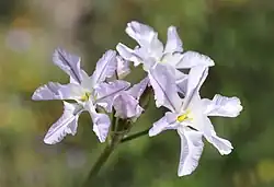 - Duże, wonne[8], długotrwałe[7], wyrastające na długich szypułkach, zebrane do 12 w baldach[7], wyrastający na smukłym głąbiku, podparty pokrywą złożoną z dwóch równowąsko-lancetowatych listków[9]. Okwiat promienisty, sześciolistkowy, biały, niebieski do fioletowego[9]. Listki okwiatu zrośnięte u nasady w rurkę, powyżej szeroko rozpostarte[7]. Charakterystyczną cechą kwiatów jest obecność 3 krótkich pręcików schowanych w rurce okwiatu oraz 3 długich prątniczek[7], niekiedy wszystkie pręciki są płodne[10]. Zalążnia górna, szyjka słupka krótka, zakończona główkowatym znamieniem[10].