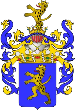 W polu błękitnym lampart wspięty, o czerwonym języku, ukoronowany. Nad tarczą korona baronowska opleciona sznurem pereł, nad którą hełm w koronie, z której klejnot: pół lamparta wspiętego jak w godle.