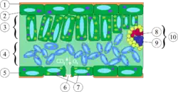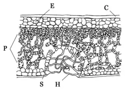 Liść asymilacyjny roślin okrytonasiennych tworzą najczęściej trzy rodzaje tkanek: epiderma, mezofil i wiązki przewodzące. Głównym składnikiem tkanki podstawowej w liściach zielonych jest mezofil[1].