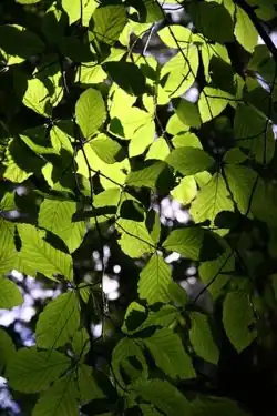 - Powierzchnia wszystkich liści na 100-letnim buku (25 m wysokości, korona zacieniająca 150 m²) wynosi ok. 1200 m². Powierzchnia chloroplastów stanowi ok. 18000 m², co oznacza, że powierzchnia pochłaniająca światło jest 120 razy większa od zajmowanej przez roślinę[17]. Z kolei na 1 ha lucerny powierzchnia liści osiąga 80-90 ha[18].