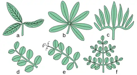 - trójlistkowe dłoniasto złożone – trzy listki odchodzą od końca ogonka liściowego lub nasady liścia (np. koniczyna Trifolium),
