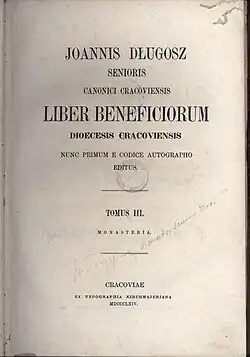 - Aleksander Przeździecki: Liber beneficiorum dioecesis Cracoviensis nunc primum e codice autographo editus. T. 1: Ecclesia Cathedralis Cracoviensis. Ecclesiae Collegiatarum. Kraków: Czas, 1863, seria: Joannis Dlugossii senioris canonici Cracoviensis opera omnia = Jana Długosza kanonika krakowskiego dzieła wszystkie, 7.