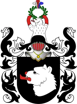 W klejnocie, na hełmie bez korony pół niedźwiedzia srebrnego na wprost, z językiem i nozdrzami czerwonymi, z głową w prawo, trzymającego w zakrwawionych łapach wieniec dębowy zielony z trzema piórami strusimi, z których prawe srebrne, środkowe czerwone, lewe błękitne.