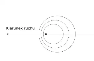 Powyżej przedstawiono schematy rozchodzenia się fali dźwiękowej wytwarzanej przez ruchome źródło w ruchu jednostajnym z prędkością niższą niż prędkość dźwięku (A), prędkością dźwięku (B) i prędkością naddźwiękową (C).