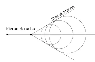 Fale uderzeniowe rozchodzą się w kierunku tylnym i zewnętrznym obiektu (tworząc tzw. stożek Macha). Im wyższa prędkość tym stożek węższy. Przy prędkości Ma = 1 stożek staje się prawie całkowicie płaski.