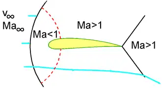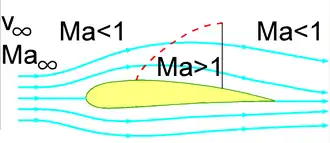 Ważnym zagadnieniem jest opływ powietrza wokół profilu skrzydła samolotu. W obrębie prędkości okołodźwiękowych pole przepływającego strumienia ma części poddźwiękowe oraz naddźwiękowe. Strumień wchodzi w region okołodźwiękowy, kiedy w pewnym miejscu profilu pojawia się prędkość naddźwiękowa (Ma > 1). Nazywa się to tak zwaną lokalną prędkością dźwięku. Prędkość przepływającego strumienia następnie maleje gwałtownie w fali uderzeniowej do prędkości poddźwiękowej (Ma < 1). Fala w miarę wzrostu prędkości przesuwa się w kierunku krawędzi spływu płatu (przypadek a).